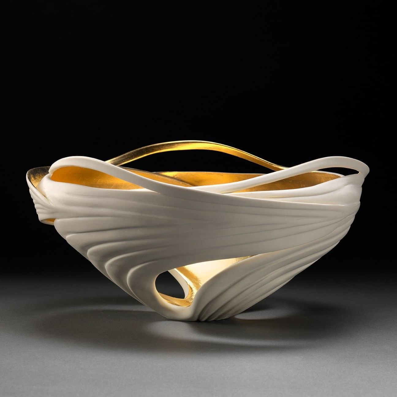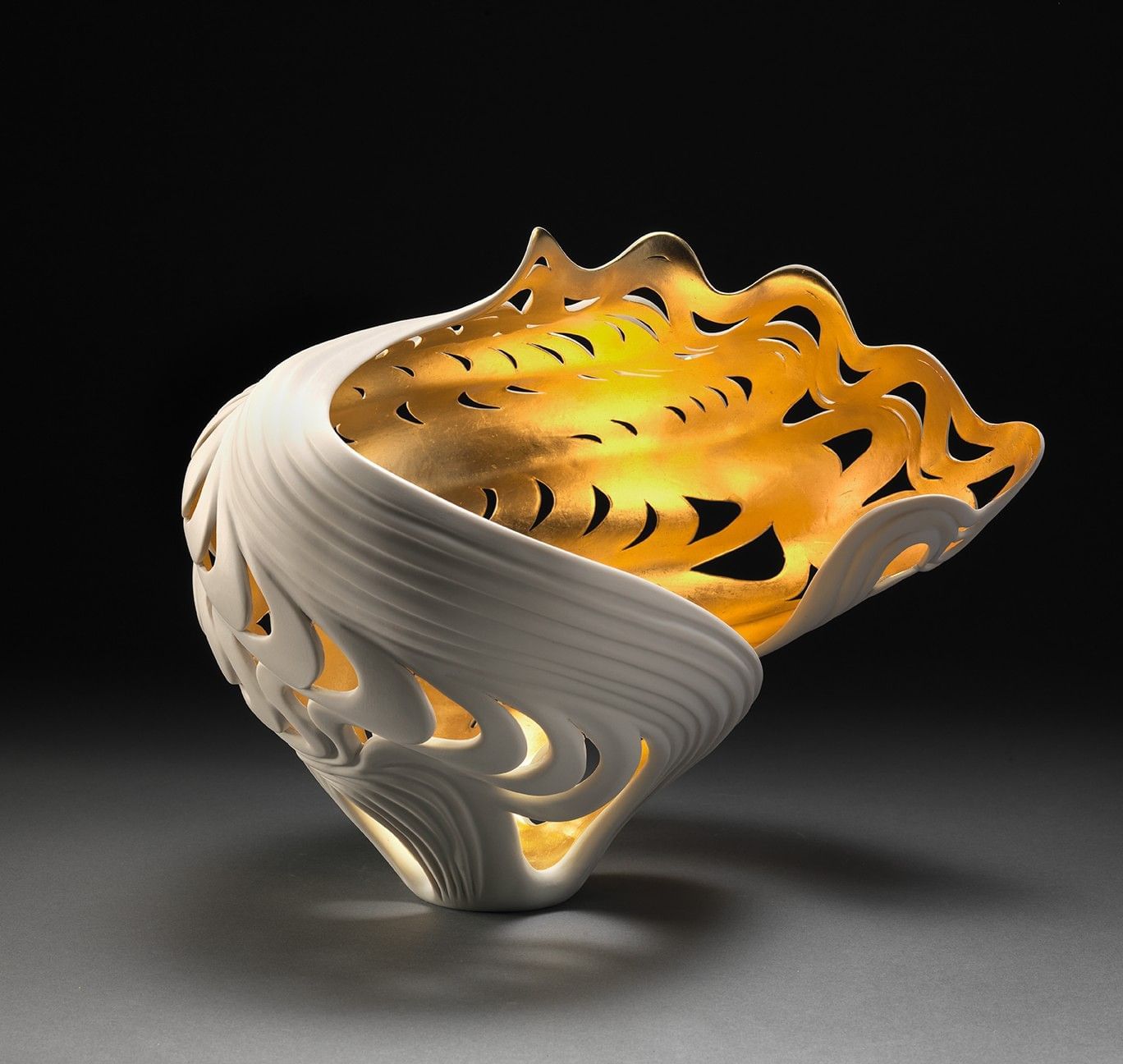 Many of her vessels are finished with gold leaf applied to the interior by her long-time collaborator and husband, Tom McCurdy. The luminous interior reflects light outward, creating a quiet warmth that feels as though each piece holds its own internal glow.